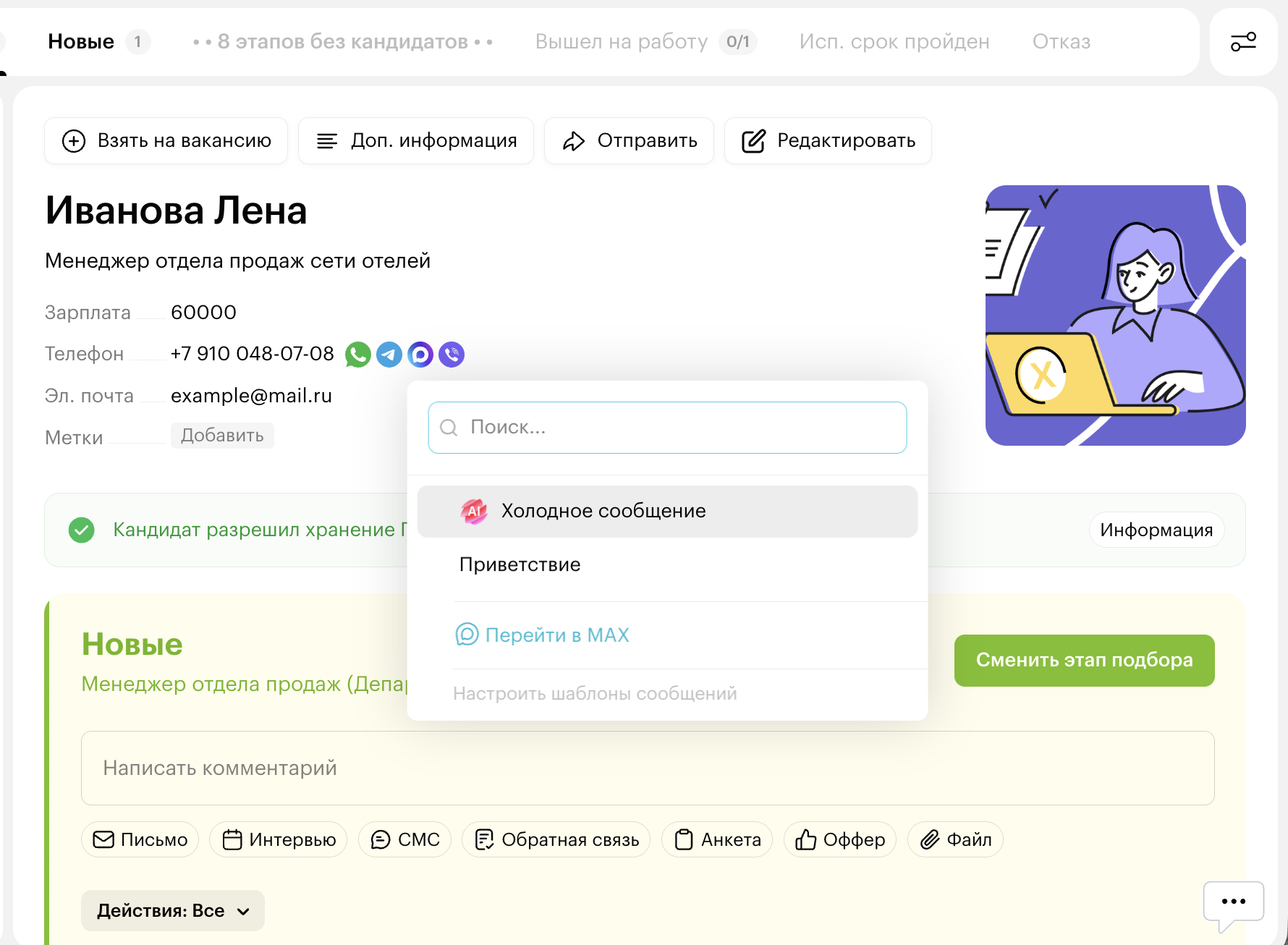 Если рекрутер авторизован в приложении или веб-версии MAX, то ему сразу откроется чат с кандидатом.