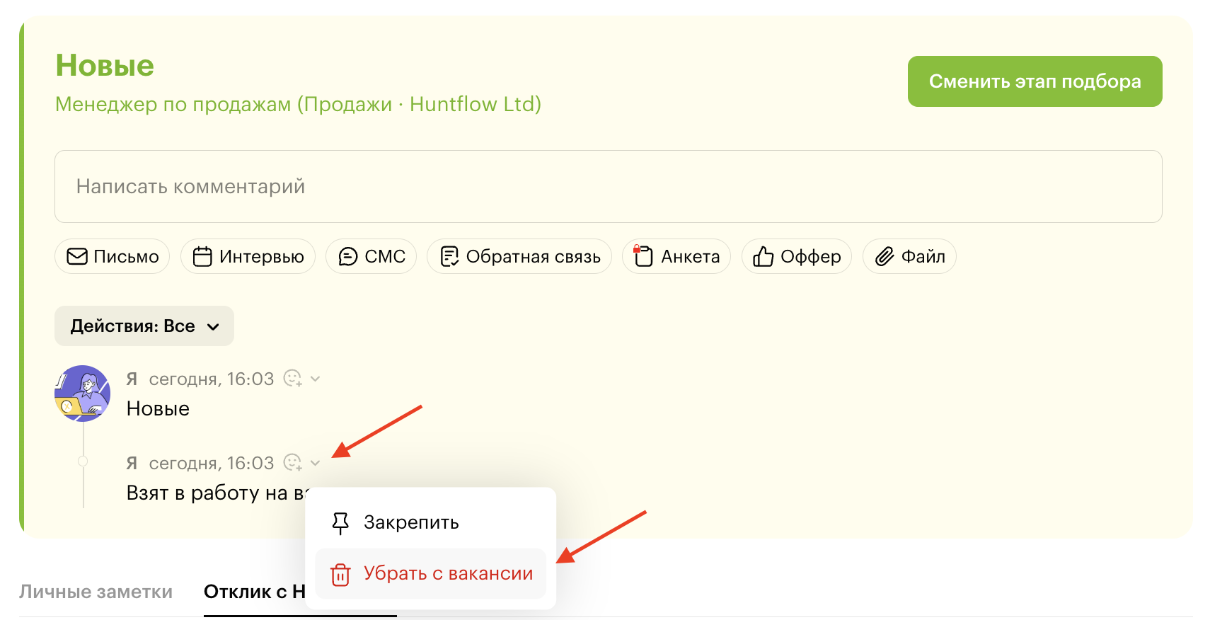 Важно: убирая кандидата с вакансии, вы удаляете всю историю работы. Восстановить историю работы по вакансии нельзя, поэтому такой способ открепления от вакансии подходит только для ошибочно прикреплённых кандидатов.